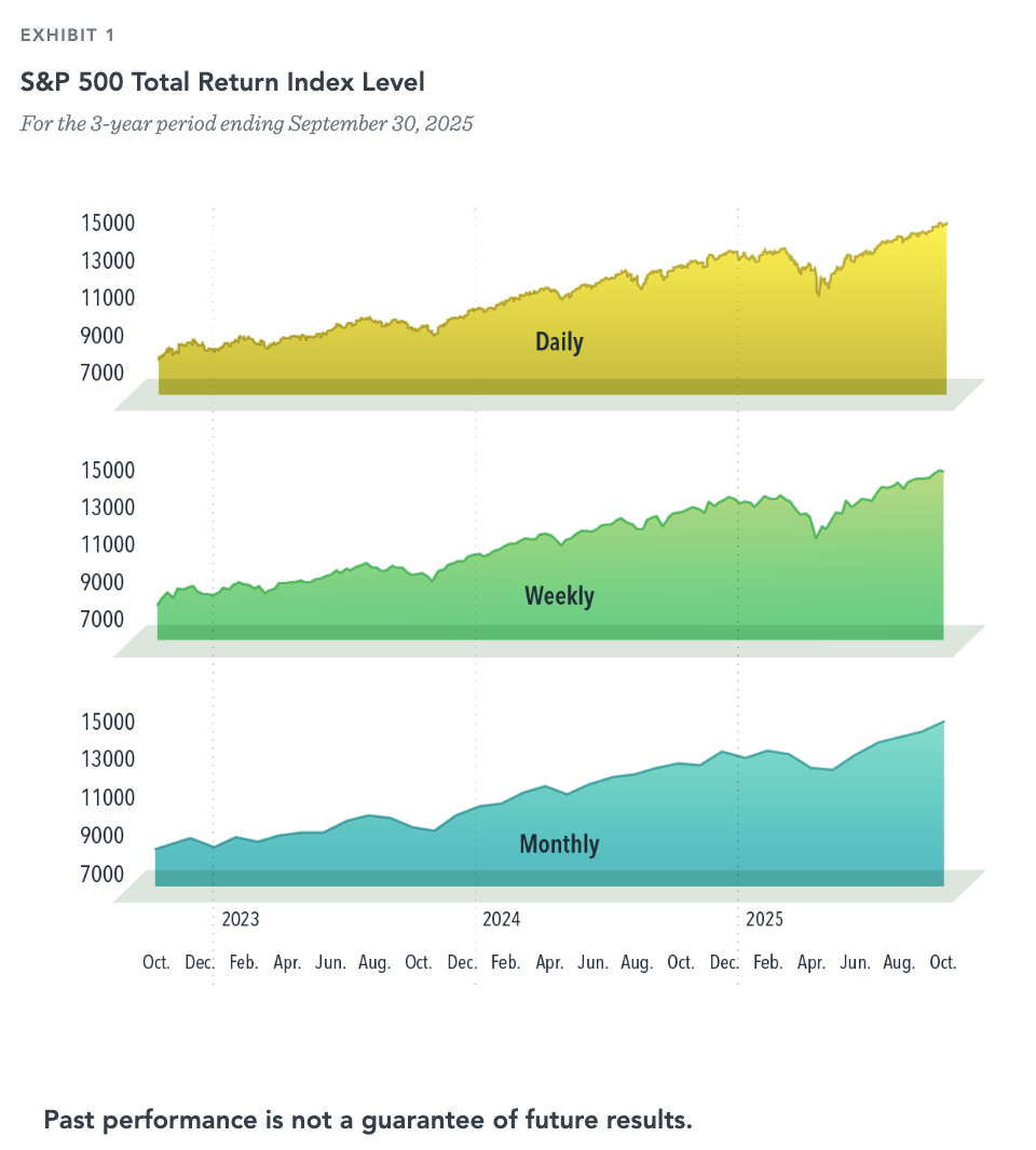 The benefit of the ignorance-is-bliss approach can be visualized by plotting out returns at longer time intervals. As you switch from daily returns to weekly, the jagged edges begin to smooth out. By the time you get to monthly returns, some of the big drawdowns (e.g., third quarter of 2023, April 2025) seem like small blips during an otherwise continuous climb.