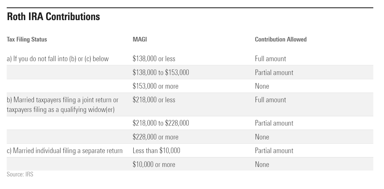 If taxpayers’ modified adjusted gross income, or MAGI, is below the higher amounts in the ranges in the following table—for example, $153,000 for someone whose tax-filing status is single—they can make a regular contribution to their Roth IRA.